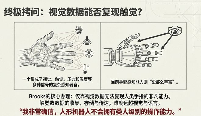 人类的手,是一个集成了视觉、触觉、压力和温度等多种信号的复杂感知器官。相比之下,当前人形机器人的手部感知能力则“没那么丰富”。布鲁克斯的核心论点是:仅靠视觉数据无法复现人类手指的非凡能力,而触觉数据的收集、存储与传达,难度远超视觉与语言信息。