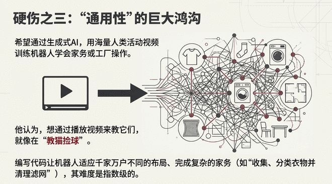 3. “通用性”的巨大鸿沟: 硅谷希望通过生成式AI,用海量人类活动视频训练神经网络,让机器人学会家务或工厂操作。演示视频看起来“令人印象深刻”,但布鲁克斯泼冷水称:想通过播放视频来教它们? 他认为,编写代码让机器人适应千家万户不同的布局、完成复杂的“收集、分类衣物并清理滤网”等家务,其难度是指数级的。