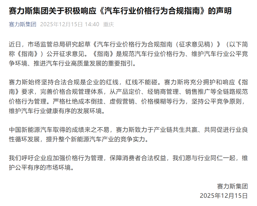 赛力斯集团今日发布关于积极响应《汽车行业价格行为合规指南》的声明。