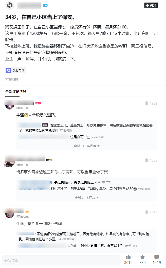 近日,一位34岁男子分享了自己的新工作——在居住的小区当保安,引发不少网友讨论。男子坦言,自己刚换工作,选择小区保安岗位。他自述还有9年房贷要还,每月需还款2100元,而保安工作到手工资4200元左右,配备五险一金。