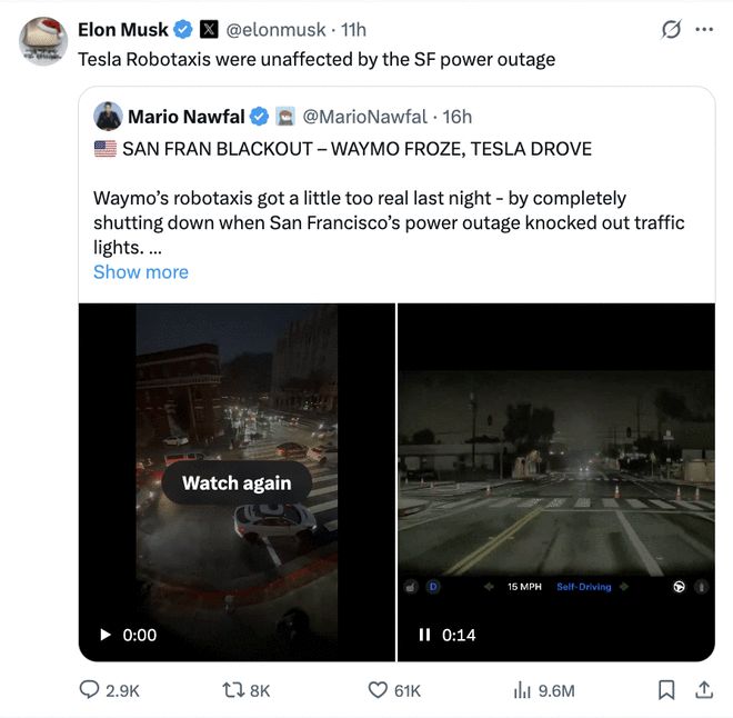 他在自家社交平台X上轻飘飘地发了一句:“特斯拉Robotaxi(机器人出租车)未受旧金山停电事件的影响。”