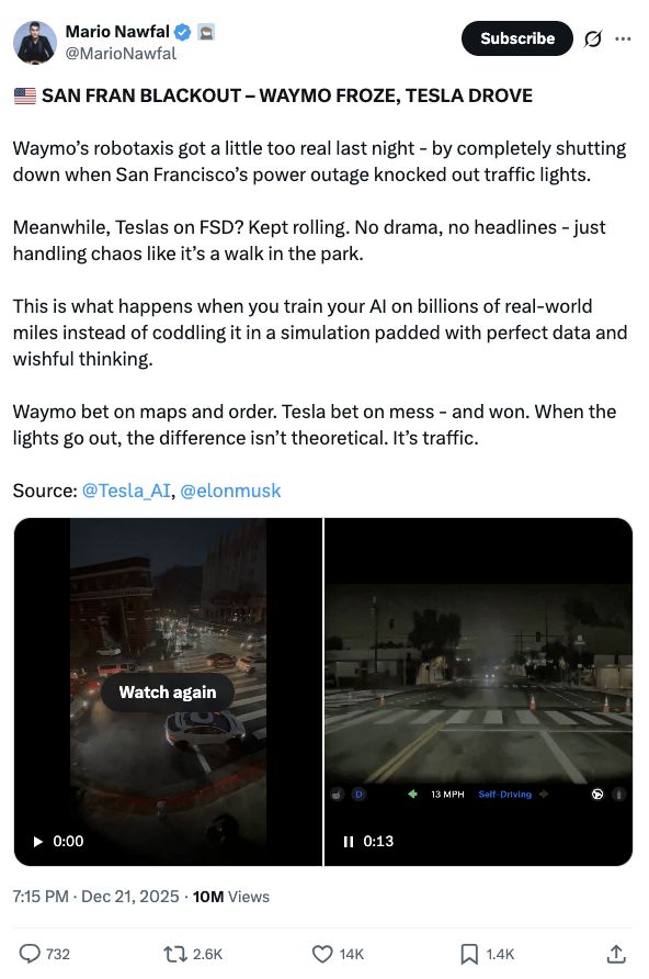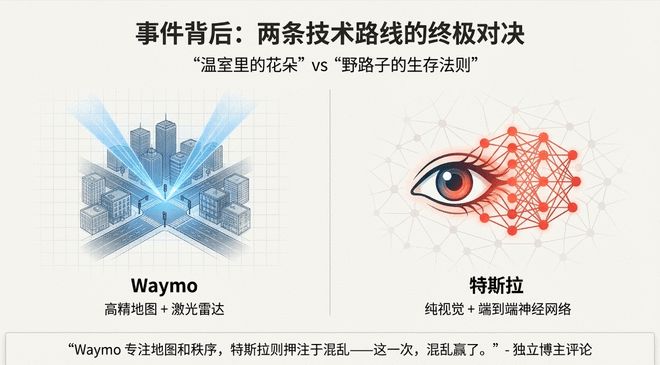 一位独立博主在社交媒体X上评论道:“Waymo专注地图和秩序,特斯拉则押注于混乱——这一次,混乱赢了。当灯光熄灭时,区别不再是纸面上的,而是真实存在的交通状况。”