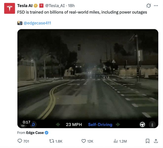 “当你在数十亿英里的真实世界里程上训练你的AI,而不是在充满完美数据的模拟中娇惯它时,就会发生这种情况,"X平台上的另一篇帖子也认为,基于混乱训练的系统能更好应对停电等现实世界问题。