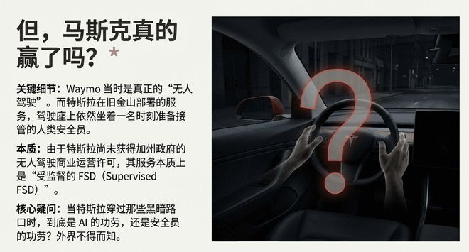 这里存在一个不可忽视的“技术性细节”:Waymo当时是真正的“无人驾驶”,而特斯拉在旧金山部署的所谓机器人出租车服务,驾驶座依然坐着一名时刻准备接管的人类安全员。