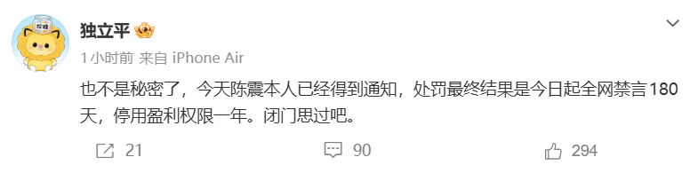 博主“@ 独立平”今日发文爆料称,今天陈震本人已经得到通知,处罚最终结果是今日起全网禁言180天,停用盈利权限一年。不过,关于最终处罚结果一事,当事人和官方还未做出相关说明和回应,后续以官方消息为准。