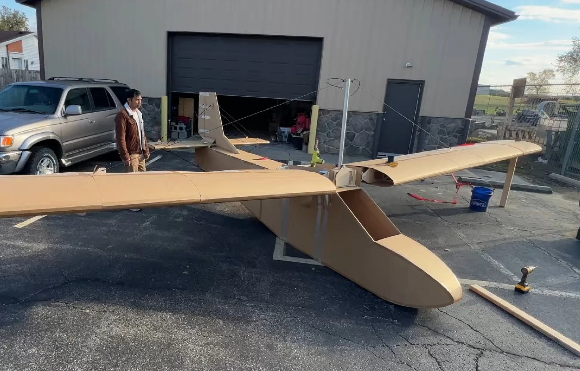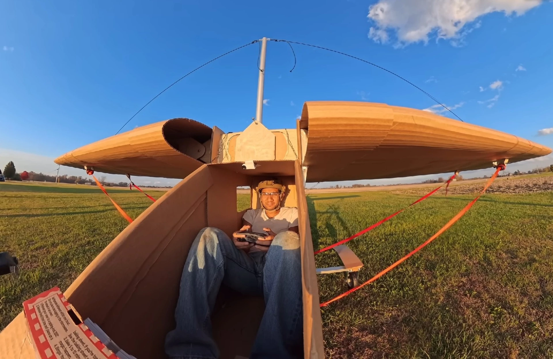 斯里波尔在多个视频中展示了纸板飞机的搭建过程:机身几乎完全由平整纸板板材拼接而成,机翼同样使用纸板蒙皮,仅在关键受力部位加入夹板和加强件,用以提升翼身连接的整体刚性。选择纸板作为“主结构材料”,一方面因为其轻便、成本低且易获取,另一方面也极大增加了项目的观赏性,但在朝载人飞行目标推进的过程中,其脆弱性和易形变的弱点也被暴露无遗。