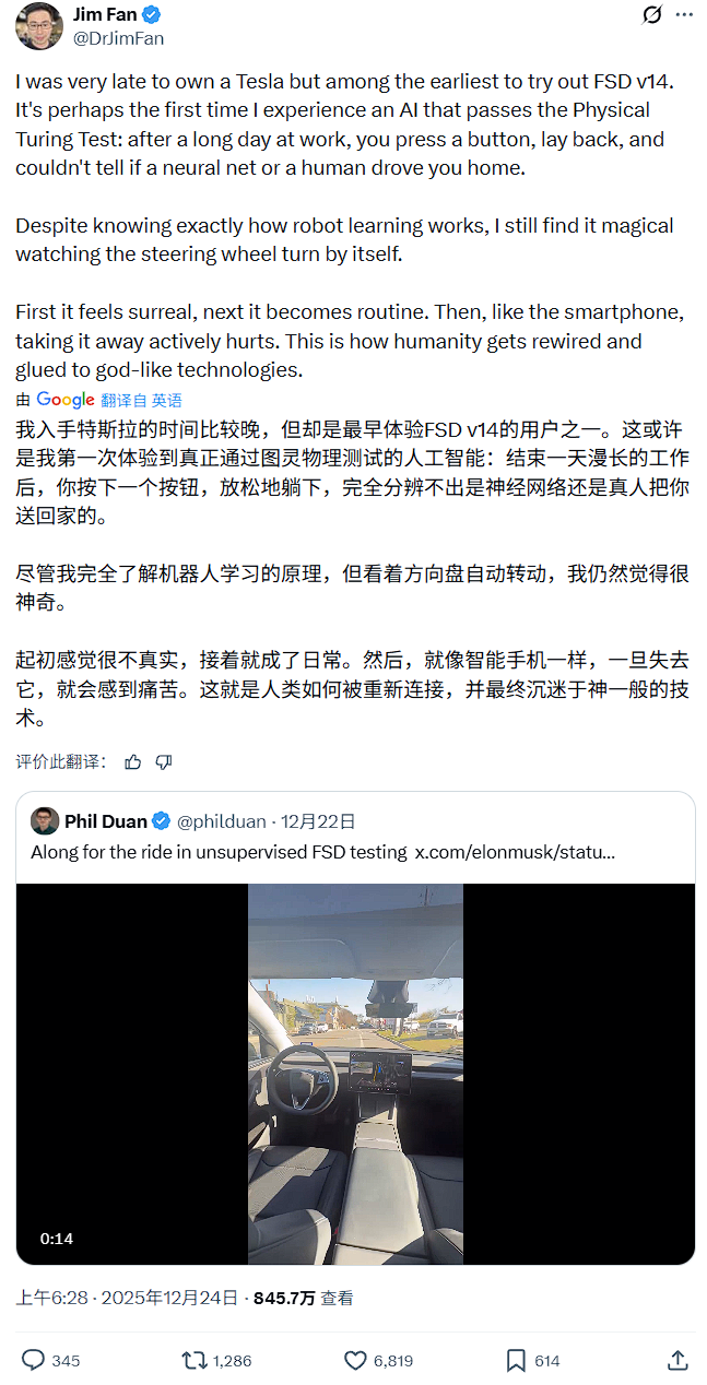 “FSD V14是首个通过我定义的'物理图灵测试'的AI系统,在驾驶过程中,我完全无法分辨是神经网络还是人类在控制车辆。它展现出的决策能力与人类驾驶员几乎毫无差异,这种无缝衔接的智能表现正是物理图灵测试的核心标准。”