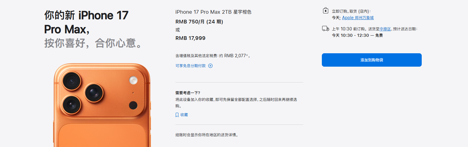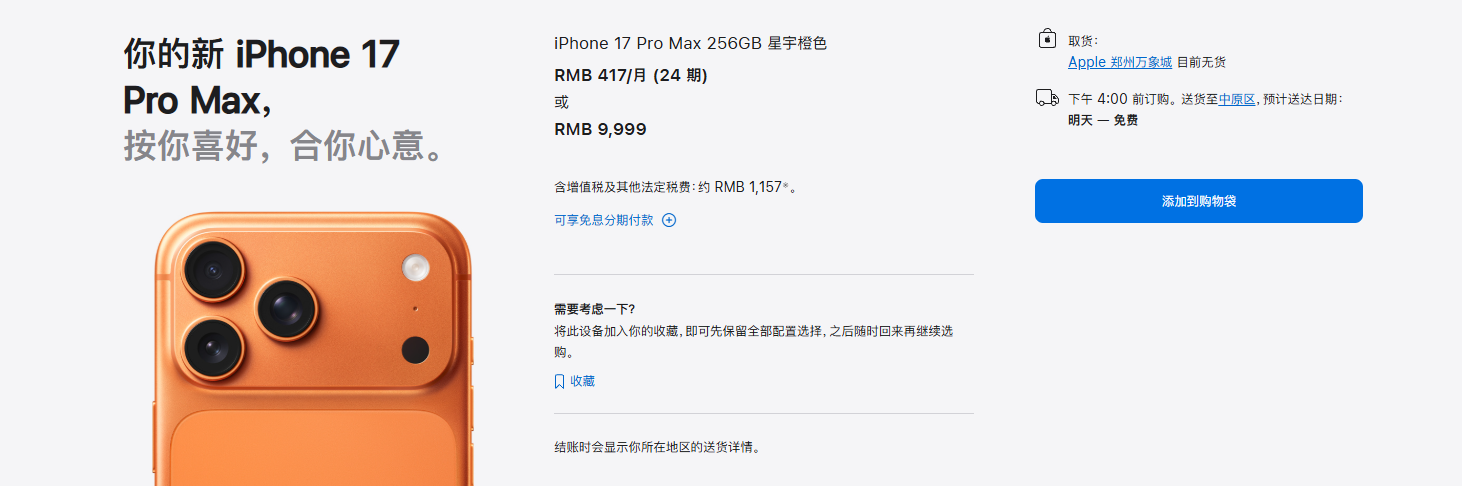 在国内市场,以郑州为例,iPhone 17标准版和iPhone 17 Pro全版本、全色系在郑州万象城Apple Store均有现货,下单当天即可到手。