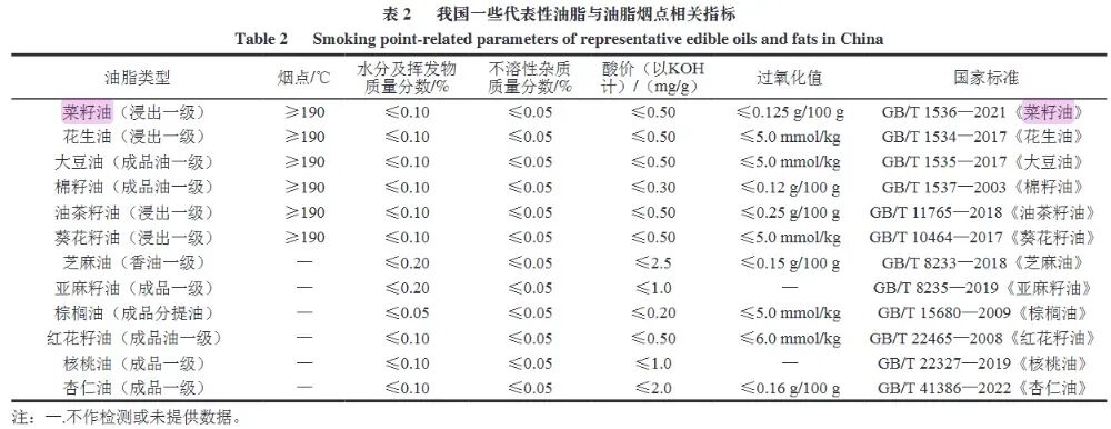 菜籽油烟点范围通常为 151~218.5℃,[6]在我国现行食用油国家标准中,菜籽油、花生油、大豆油等食用油脂一级油的烟点均统一确定为“≥190℃”。菜籽油能够轻松胜任煎、炸、爆炒等各种高温烹饪方式,是名副其实的适合中国厨房的油。