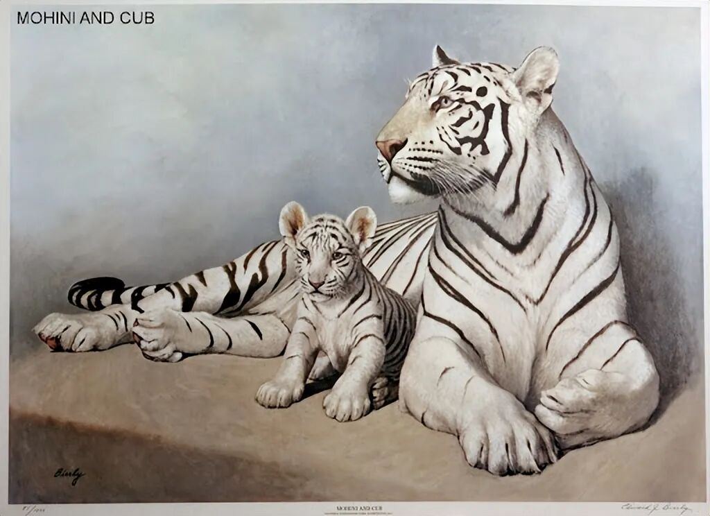2004年,在西班牙的一个动物园中,两只正常颜色的孟加拉虎生出了一只蓝眼睛、没有条纹的白色老虎幼崽。
