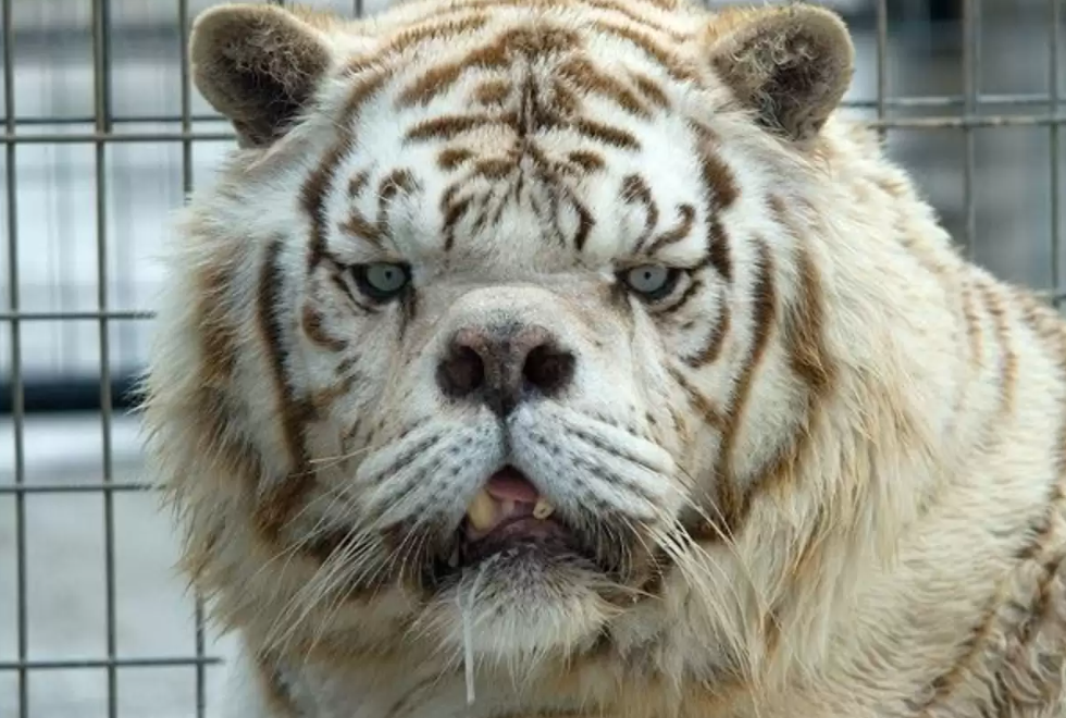 上面这只白色孟加拉虎叫肯尼,它就是人们培育白虎的受害者之一,它鼻子短,脸宽,牙齿也有明显的缺陷,外表都能看出来不是正常老虎。