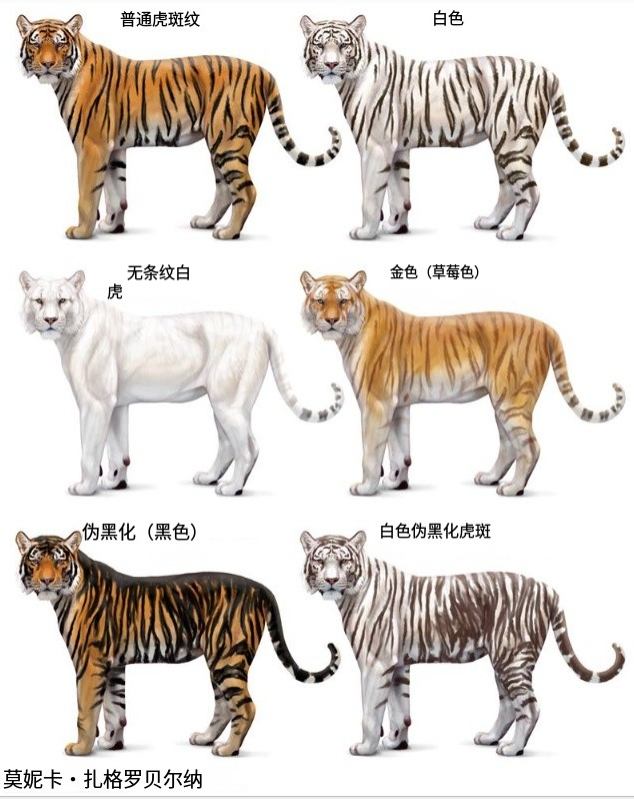在无条纹白虎的案例中,它们的白色皮毛基因来自于白色孟加拉虎,而无条纹基因可能来自于西伯利亚虎。