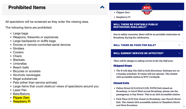 在纽约市即将迎来新市长就职典礼之际,一份特别的“禁带物品清单”引发了关注。在官方发布的入场禁令清单中,除了常规的枪支武器、无人机、大型背包和爆炸物品外,两款电子产品赫然在列,分别是树莓派和多功能黑客工具Flipper Zero。