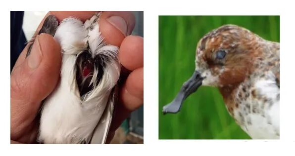 部分飞行撞击造成的伤害(脊柱损伤、眼伤、喙伤)。图片来源:WWT