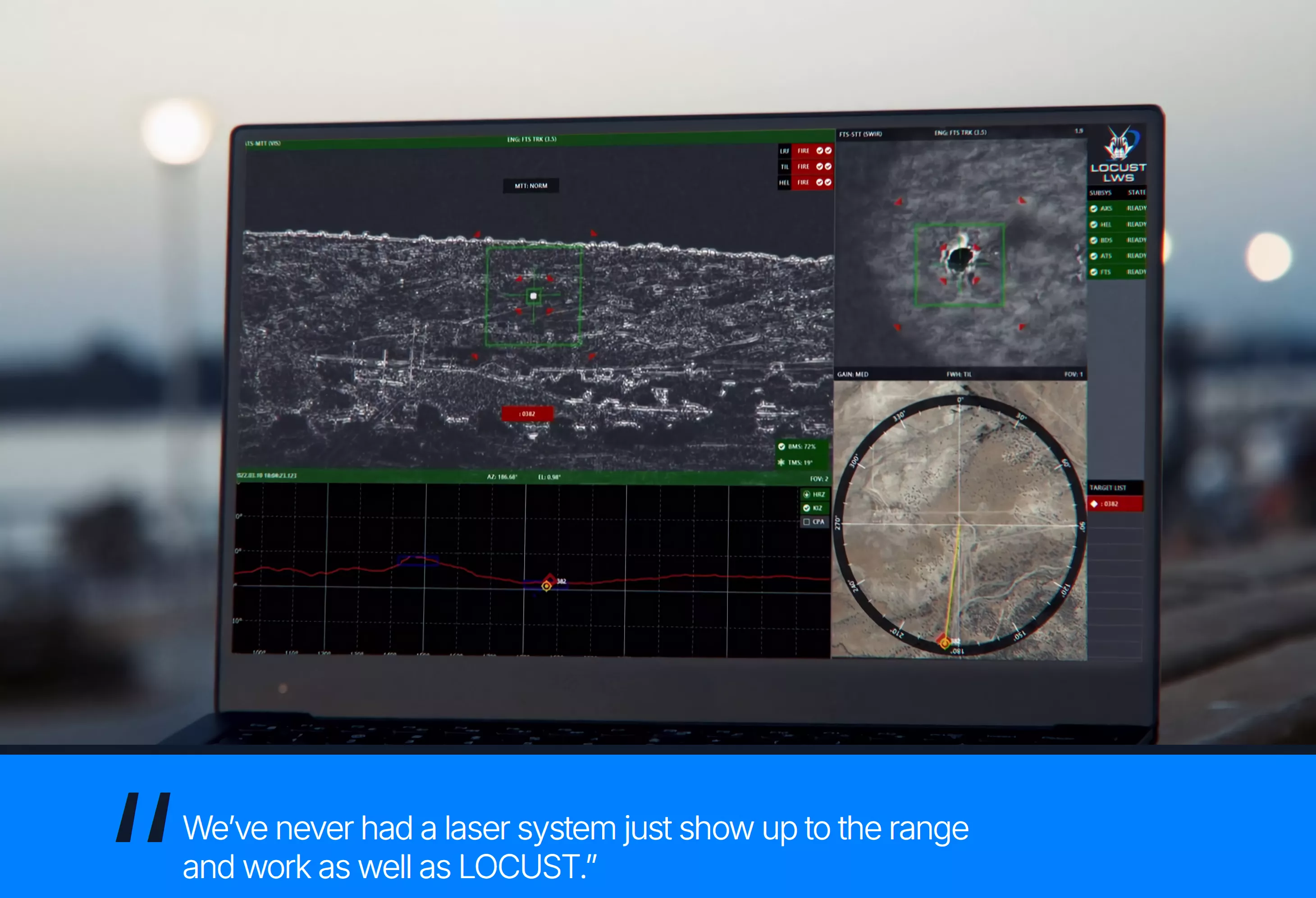 “蝗虫”支持自动与手动两种操作模式。 自动功能可执行多目标红外搜索与跟踪,在高清画面上叠加超高带宽跟踪信息,并通过开放架构接入多种类型传感器;在手动模式下,操作员可使用一只常见的游戏手柄控制系统,借助精确跟踪、激光测距及目标获取/跟踪系统等功能进行操作,从而在高密度威胁环境下,以较低训练成本保持较高作战效能。
