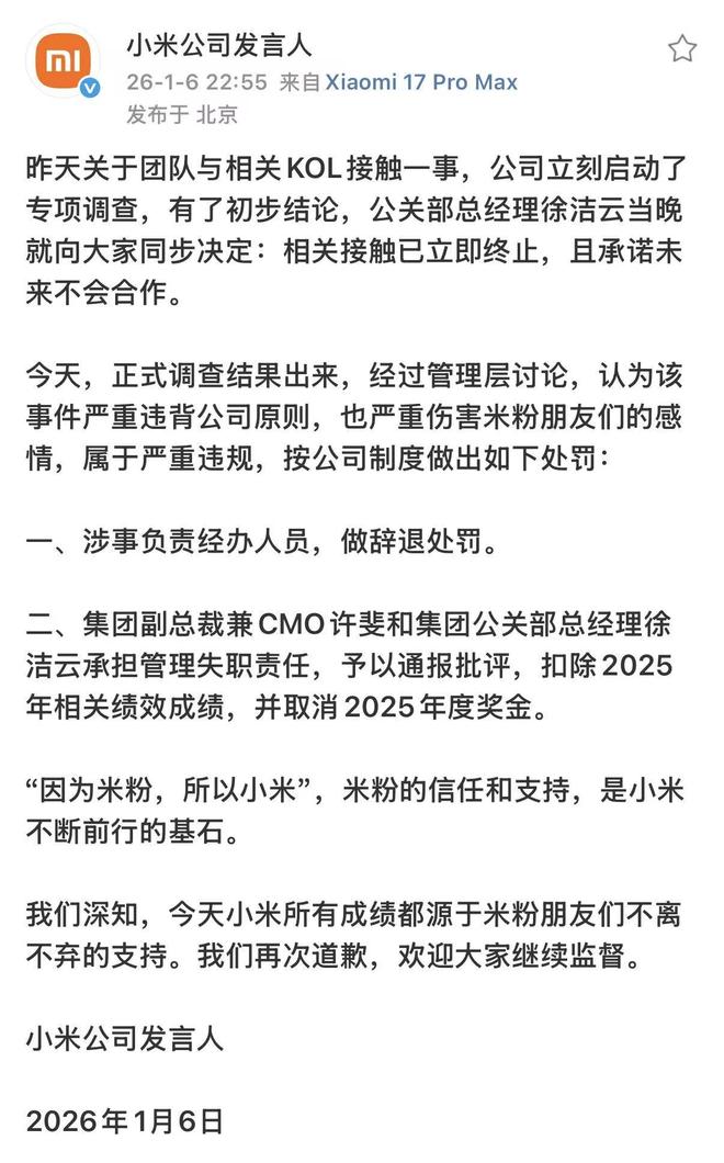 1月6日,针对近日小米与博主“万能的大熊”合作引发的相关争议,小米公司发言人官微发表声明称,辞退涉事负责经办人员,同时对集团副总裁兼CMO许斐和集团公关部总经理徐洁云予以通报批评,扣除2025年相关绩效成绩,并取消2025年度奖金。