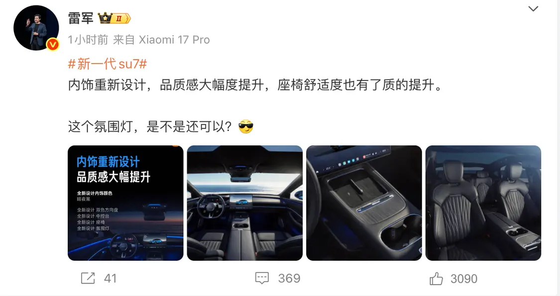 1月7日,小米公司创始人、董事长、首席执行官雷军宣布新一代SU7预计2026年4月上市,并同步公布了新车配置。雷军表示,内饰重新设计,品质感大幅度提升,座椅舒适度也有了质的提升。“这个氛围灯,是不是还可以?”