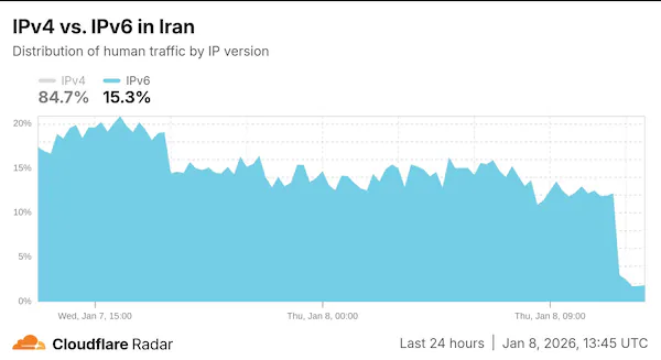 负责互联网基础设施与安全业务的公司Cloudflare旗下监测平台Cloudflare Radar在社交媒体上发布信息称,伊朗的IPv6地址空间使用量下滑约98.5%,IPv6流量占比也从12%暴跌至1.8%。该公司将这一变化与伊朗政府在全国多地示威浪潮蔓延之际“选择性阻断互联网访问”联系起来。