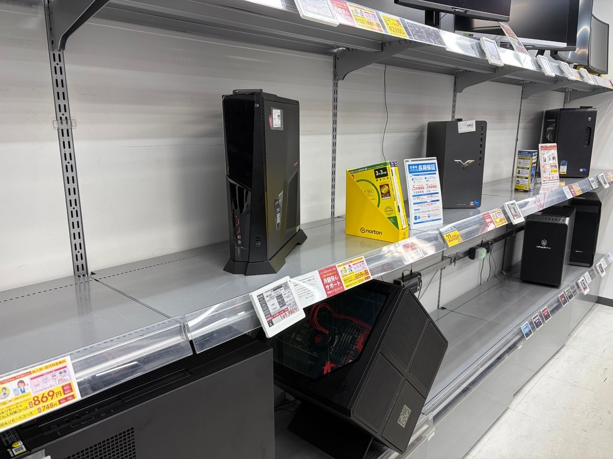 贴文配图显示,店内原本整齐陈列电竞主机的货架已几乎全空,空荡荡的展台折射出当前日本PC市场严峻的“硬件荒”。