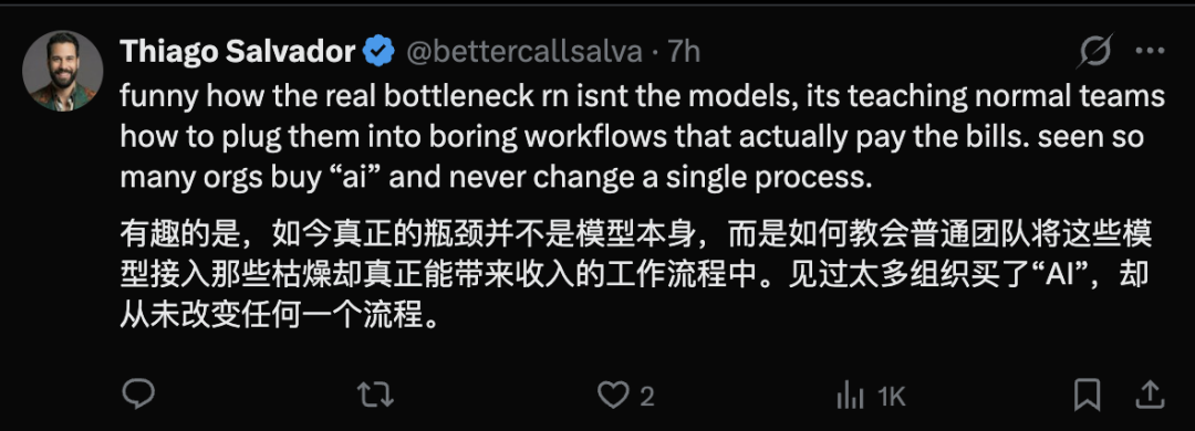 也有网友提到,真正的挑战在于如何将AI融入工作流程中:见过太多组织买了“AI”,却从未改变任何一个流程。