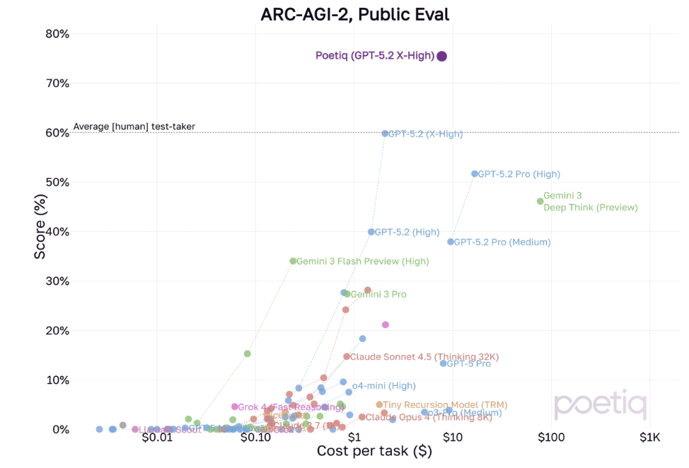 但Poetiq的加入,使GPT-5.2(X-High)的得分从60%直接拉升到了75%,从勉强及格(人类平均水平)迈入了优等生的行列(显著超越人类平均水平)。
