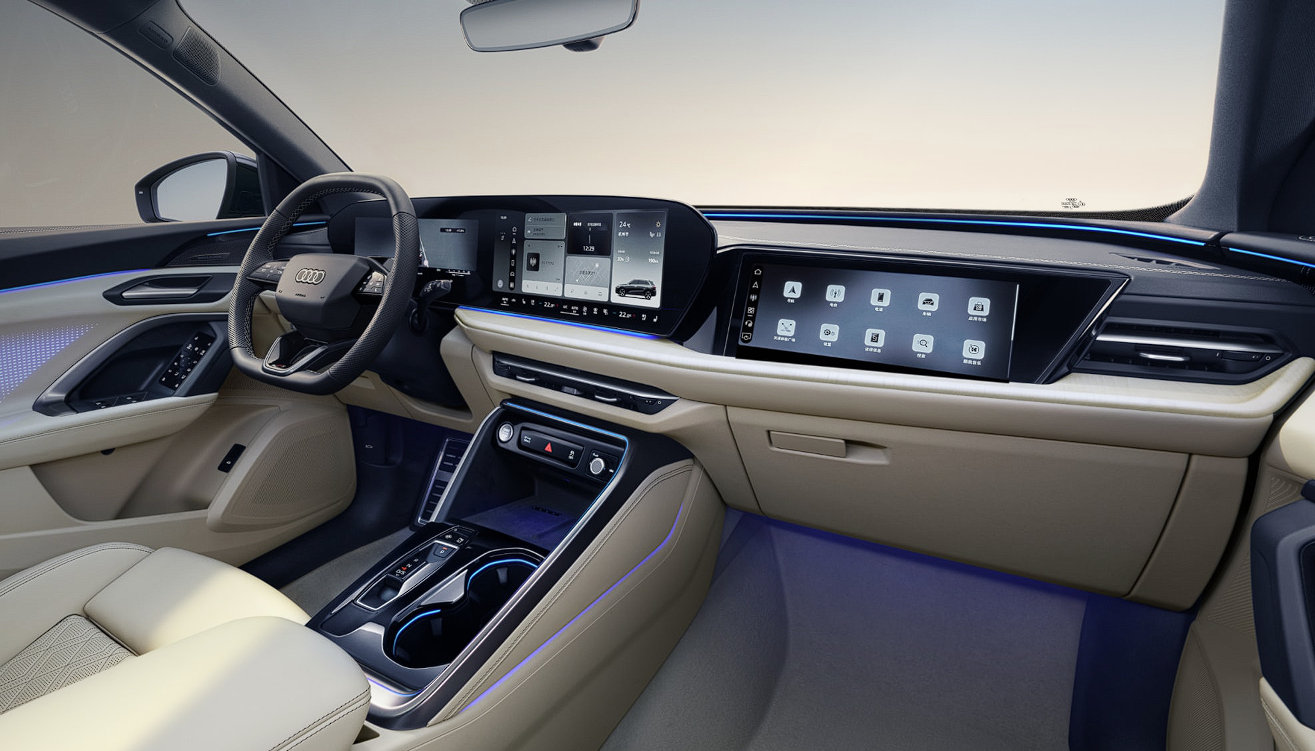 内饰同样为最新设计方案,此前在全新的A5L之上已经出现,主驾屏和中控屏采用环绕式的OLED曲面屏设计,由11.9英寸仪表盘和14.5英寸触摸屏构成,副驾配备10.9英寸防窥屏,避免分散驾驶员注意力。