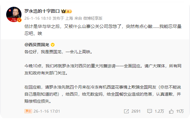 今日,西贝创始人贾国龙公开发文喊话罗永浩 ,就四个月来在冷冻有机西蓝花事情上欺骗全国网友,给西贝,给无数宝妈,给全国餐饮业造成的危害,认真道歉,并赔偿相应损失。对此,罗永浩转发该博文回应:“估计是华与华之后,又被什么山寨公关公司忽悠了,突然有点心酸……我能忍尽量忍吧,唉。”