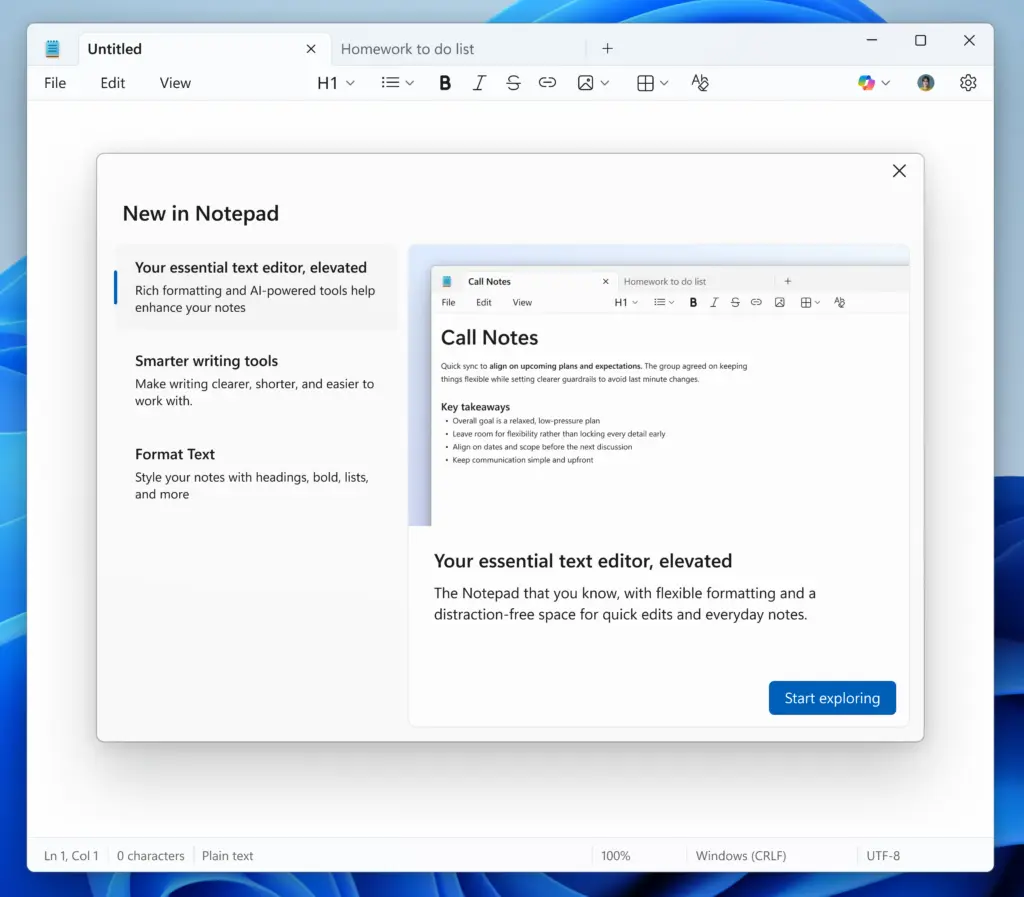 微软为Windows记事本新增更多格式化工具 画图工具融入更多AI功能