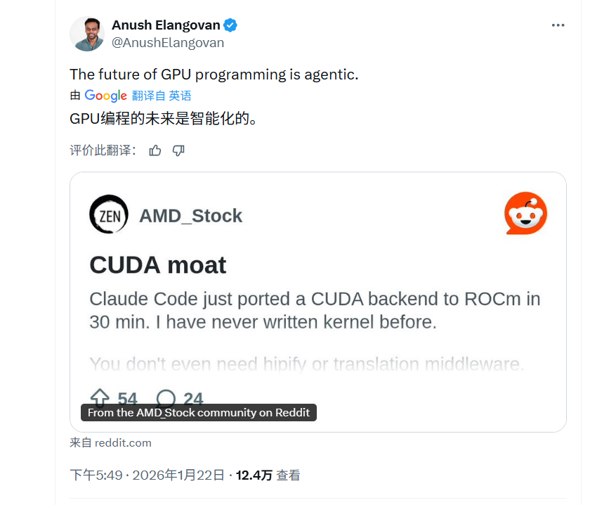 就连AMD软件开发副总裁 Anush Elangovan 都对此深感震惊,直言GPU编程的未来,必将属于AI智能体。