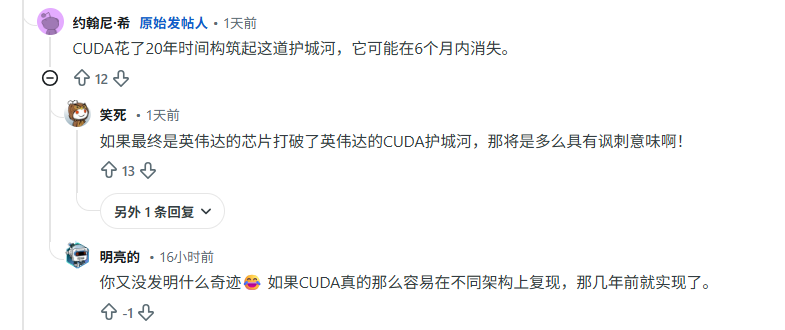 “CUDA花了20年时间构筑起这道护城河,可能在6个月内消失。”johnnytshi说。