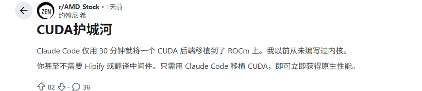 Claude Code直接把NVIDIA的护城河给铲平了,而且只花了半小时!近日,科技圈被一则消息彻底引爆:Reddit平台上,开发者johnnytshi分享了一项颠覆性操作——Claude Code仅耗时30分钟,便成功将一整套完整的CUDA后端代码,移植到了AMD的ROCm平台,而且无需任何中间转换层。