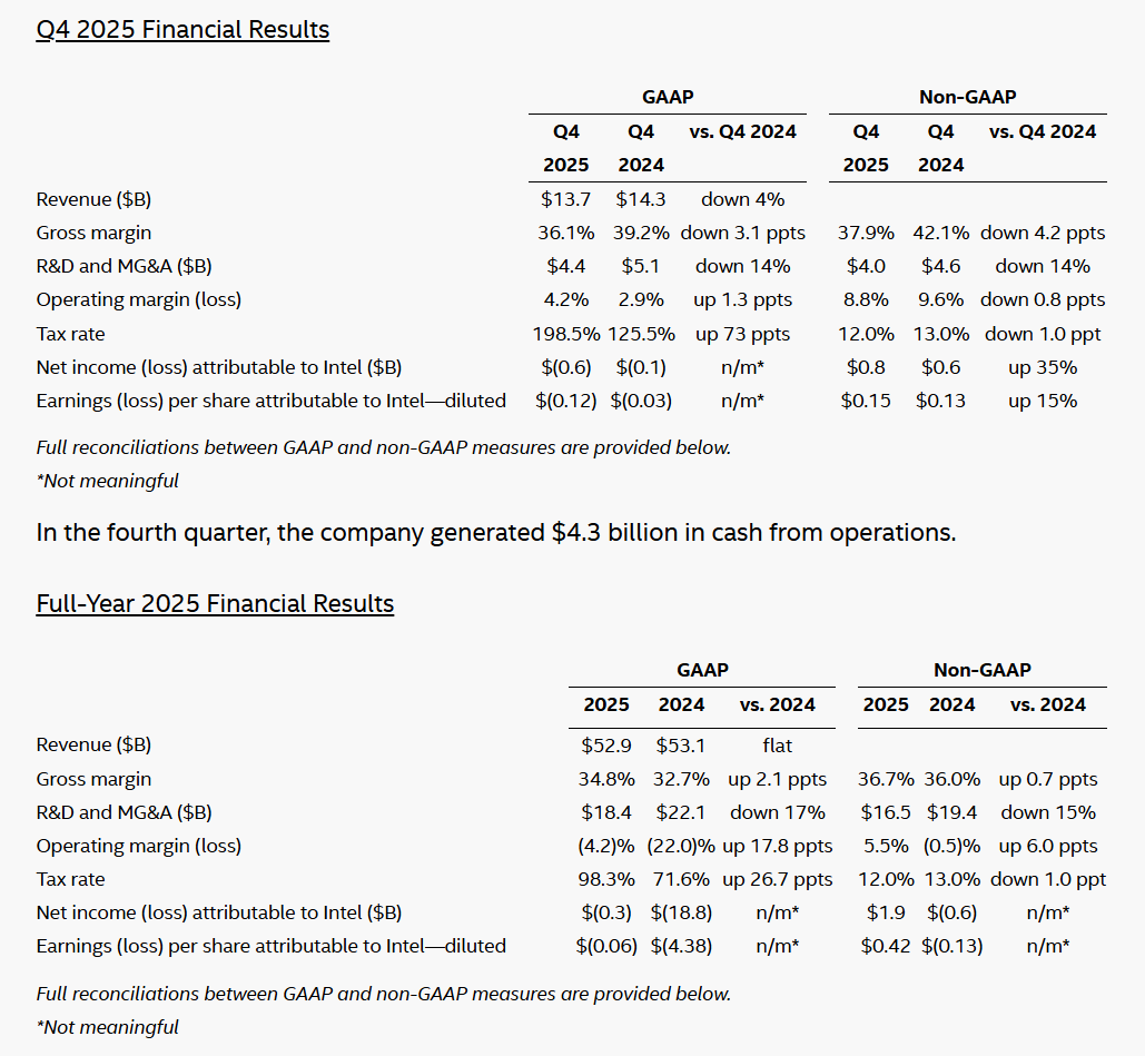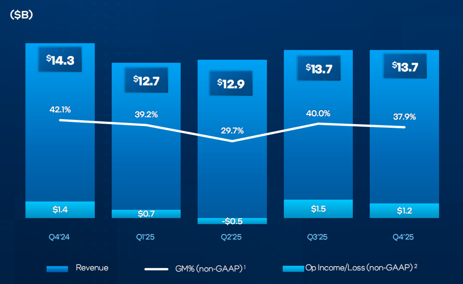 Intel今天公布了2025年第四季度和全年财报,依然存在亏损,但已经走到了扭亏为盈的边缘。按照国际通用会计准则(GAAP),Intel第四季度总收入137亿美元,同比下滑4%,毛利率36.1%,同比下滑3.1个百分点,净亏损6亿美元,同比扩大5倍,每股亏损0.12美元。