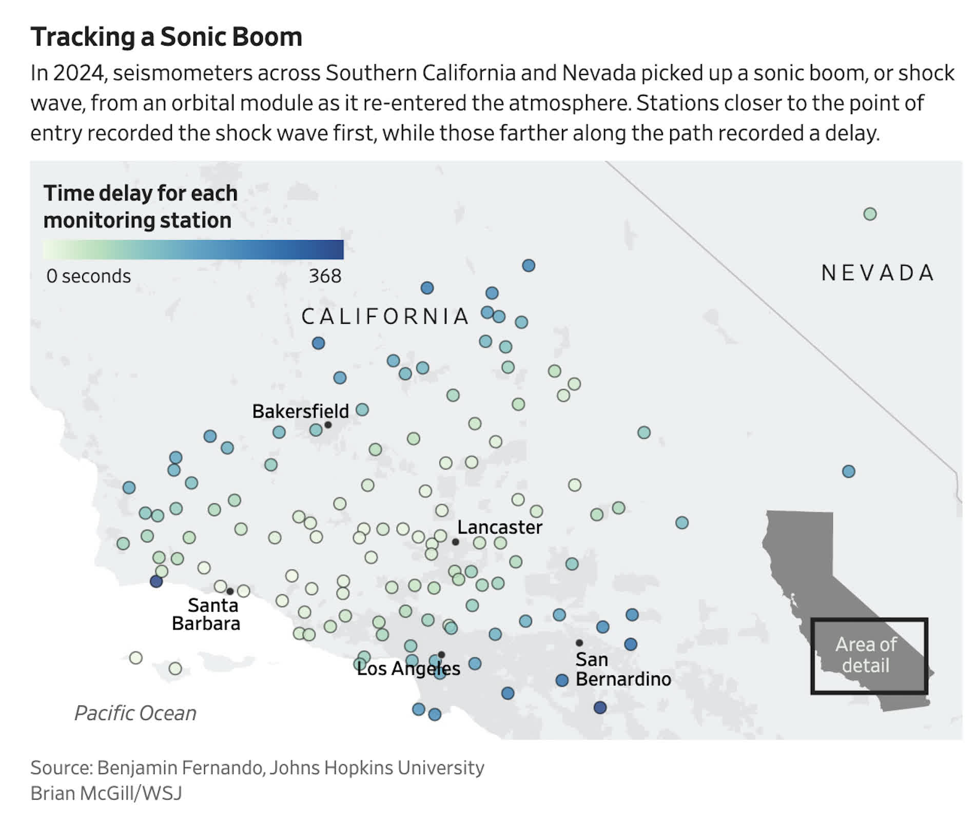 该研究由伦敦帝国理工学院行星地震学家卡拉兰布斯与约翰斯·霍普金斯大学的费尔南多联合主导,两人调取了美国西南部超过一百个地面传感器的数据,成功重建了中国“神舟十五号”飞船残骸在2024年4月再入时的过程。当时产生的冲击波横扫从南加州到拉斯维加斯的广大地区,数以千万计居民上空都曾被这一音爆“刷”过,并在区域内留下清晰可辨的地震学“指纹”。