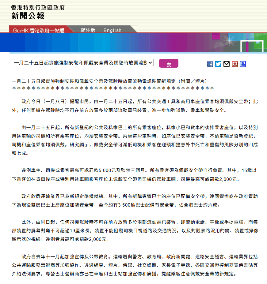 中国香港安全带新规已于1月25日开始实施。根据新规,1月25日起,所有公共交通工具和货车,乘客均须佩戴安全带;并且,任何司机在驾驶时均不可在前方放置多于两部电子设备,进一步加强道路、乘车和驾驶安全。违例车主、司机或乘客最高可处罚款5000港元及监禁三个月,所有乘客须为佩戴安全带自行负责。