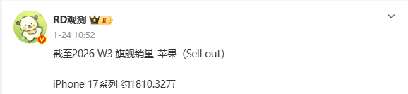 你知道iPhone 17系列在中国国内市场卖的有多好吗,已经奔着2000万台去了。近日,博主@RD观测给出的数据显示,截至2026年第三周,iPhone 17系列在国内的销量约为1810.32万台。