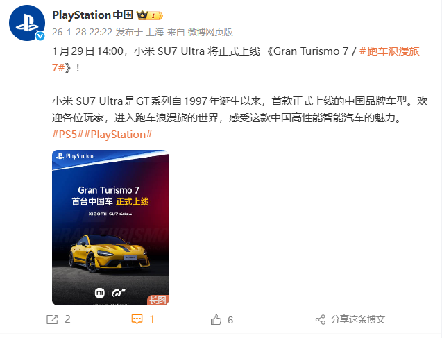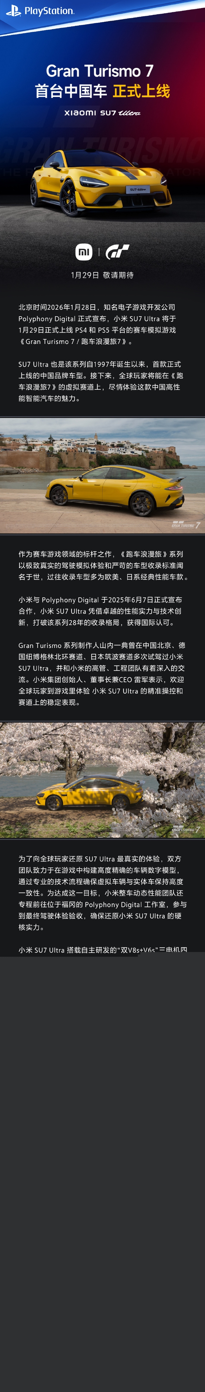 今日,小米汽车宣布,1月29日14:00,小米SU7 Ultra将正式上线《Gran Turismo 7/ 跑车浪漫旅7》(《GT赛车7》)。索尼PlayStation中国表示,小米SU7 Ultra是GT系列自1997年诞生以来首款正式上线的中国品牌车型,全球玩家将在虚拟赛道上体验这款高性能智能汽车。
