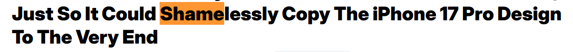 国产手机镜像模仿iPhone,连老外都看不下去了,直言“无耻”。wccftech发文称,中国智能手机厂商往往毫不掩饰地抄袭苹果的各种设计元素,无论是外观还是软件方面。比如下面这款,为了更像苹果,不仅颜色用了相近的橙色,还在手机后置摄像头模组左下角添加了一个假镜头(据说是红外天线),使其看起来更像iPhone 17 Pro和iPhone 17 Pro Max。