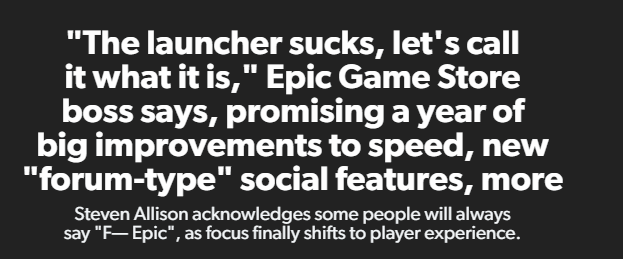 他表示,Epic在去年已经推出了不少改进内容,今年将继续解决一些大问题。他在采访中直言:“目前启动器太垃圾了,简单来说就是非常慢。”