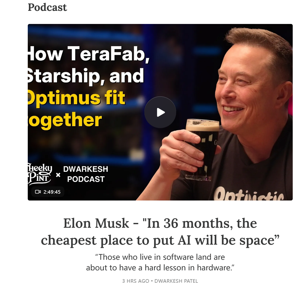 “记住我的话,36个月内太空会成为部署人工智能的最便宜去处”