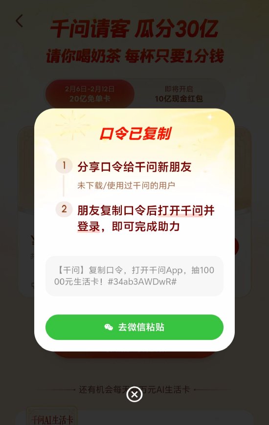 但上线仅半天,有用户实测发现,阿里千问红包最新的分享口令在微信内已经无法复制,这也意味着用户无法通过微信复制口令参与千问“春节30亿免单”活动。