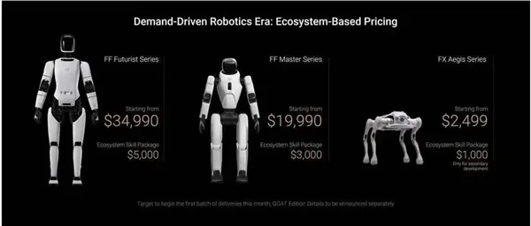 其中,全尺寸人形机器人Futurist(未来主义者)系列被FF定义为“职业型具身智能人形机器人”定价34990美元起(约合人民币24.2万元),另外还可选装生态技能包价格为5000美元。