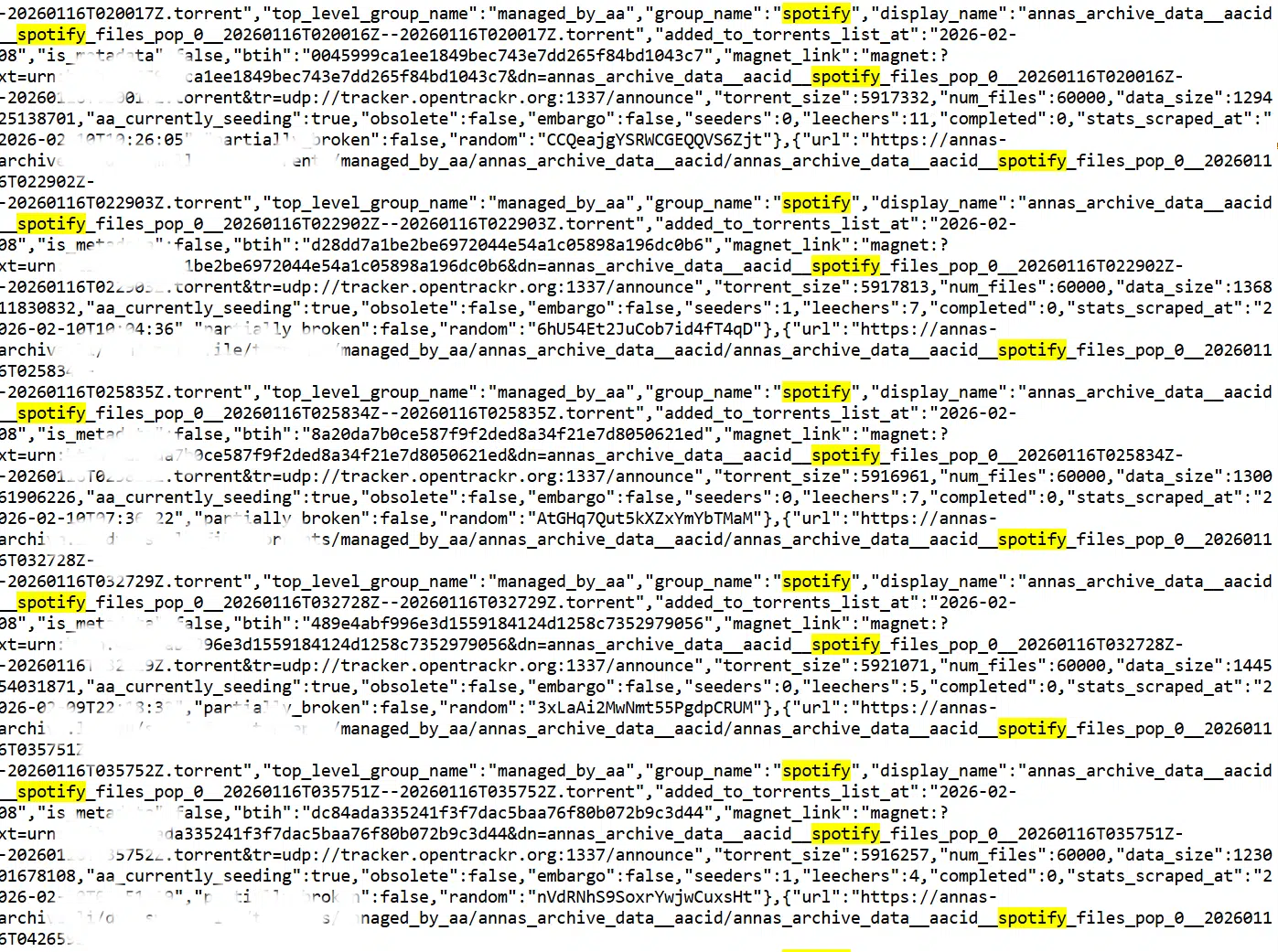 虽然该站点并未在首页正式官宣,但已有用户在网站托管的 json 文件中发现了数十个新的 Spotify 下载链接。这些文件大多于 2 月 8 日上传,目前包含 47 个音乐种子和一个元数据种子。据 Reddit 社区讨论反馈,这些文件真实有效,大小从几百 KB 到数 MB 不等。文件命名采用 Spotify 内部的抽象 ID,不直接显示歌名,但文件内部嵌有完整的媒体信息,包括歌手、专辑、出版商及封面艺术。这批种子被标记为"pop_0",推测是根据流行度排名的首批资源。