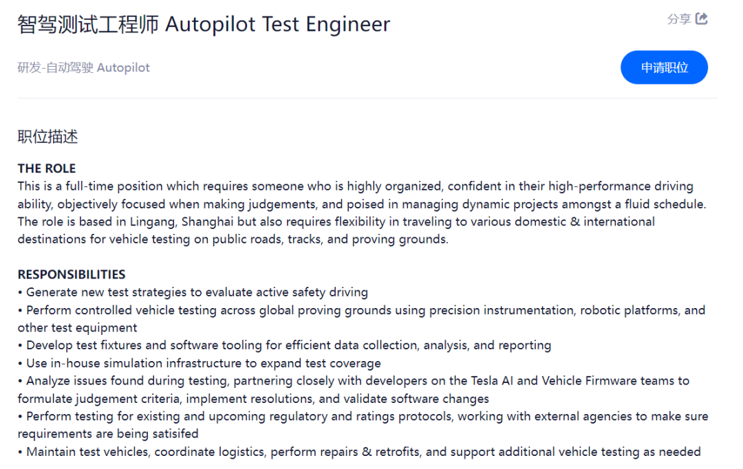 特斯拉上海官网招聘主页,更新了一个新的“智驾”岗位:智驾测试工程师。