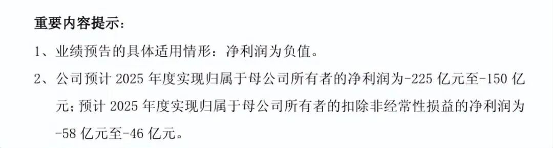 经财务部门初步测算,公司预计2025年度实现净利润为-225亿元至-150亿元。