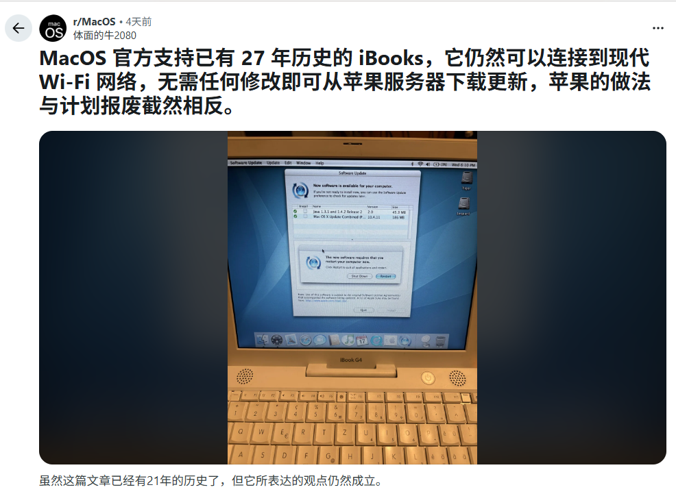 近日,reddit平台一篇帖子引发怀旧热潮,这款已有21年历史的苹果iBook G4笔记本,2026年开机后竟成功连接现代Wi-Fi,还从苹果服务器下载到系统补丁,网友直呼“画面太美”,苹果对旧设备的长期支持也再度引发热议。