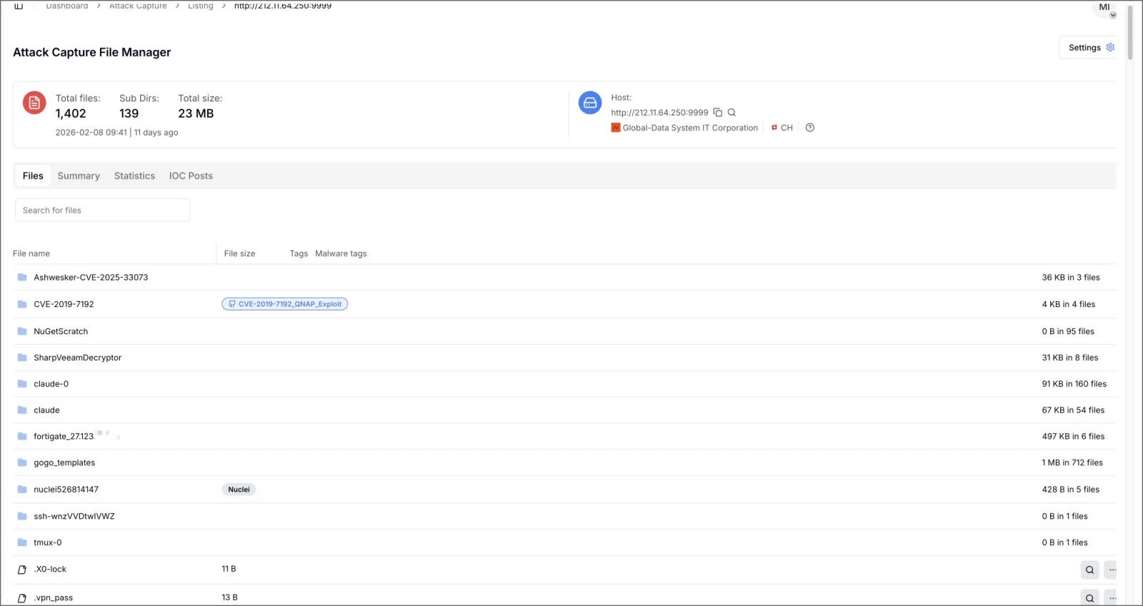 研究者指出,该服务器位于瑞士苏黎世、托管于 AS4264(Global-Data System IT Corporation),其目录结构内含有 CVE 利用代码、FortiGate 配置文件、Nuclei 扫描模板以及 Veeam 凭据提取工具等。 值得注意的是,其中两个名为 “claude-0” 和 “claude” 的文件夹共包含 200 余个文件,内有 Claude Code 的任务输出、会话差分以及缓存的提示词状态,表明攻击者与商用 AI 工具之间存在持续、系统性的交互。 另一个名为 “fortigate_27.123(完整 IP 已脱敏)” 的文件夹则保存了疑似来自某台已攻陷 FortiGate 设备的配置数据和凭据信息。