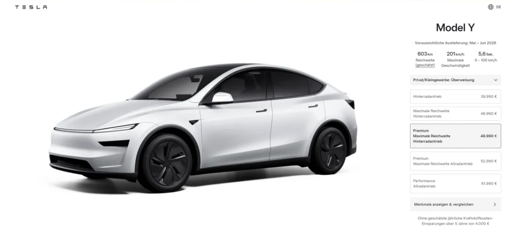 据悉,新车预计交付时间为2026年5至6月,目前特斯拉欧洲官网已更新该车型的相关售价与参数信息。