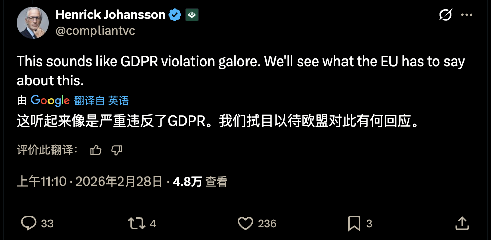 专注欧美企业合规的大V也指出,签订该协议可能严重违反了GDPR,或将招致欧盟祖传的天价罚款。