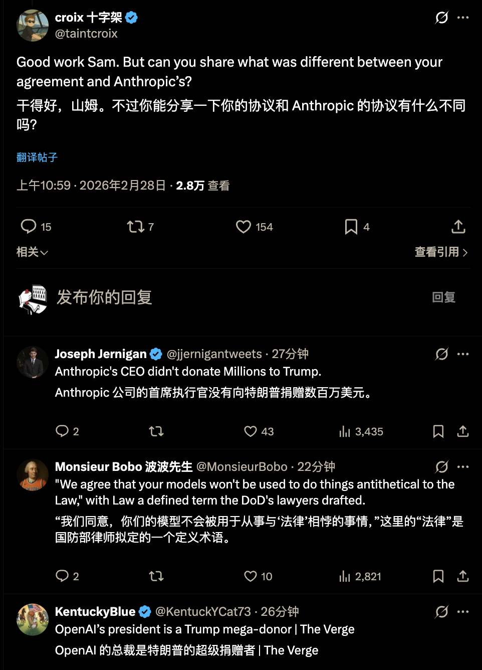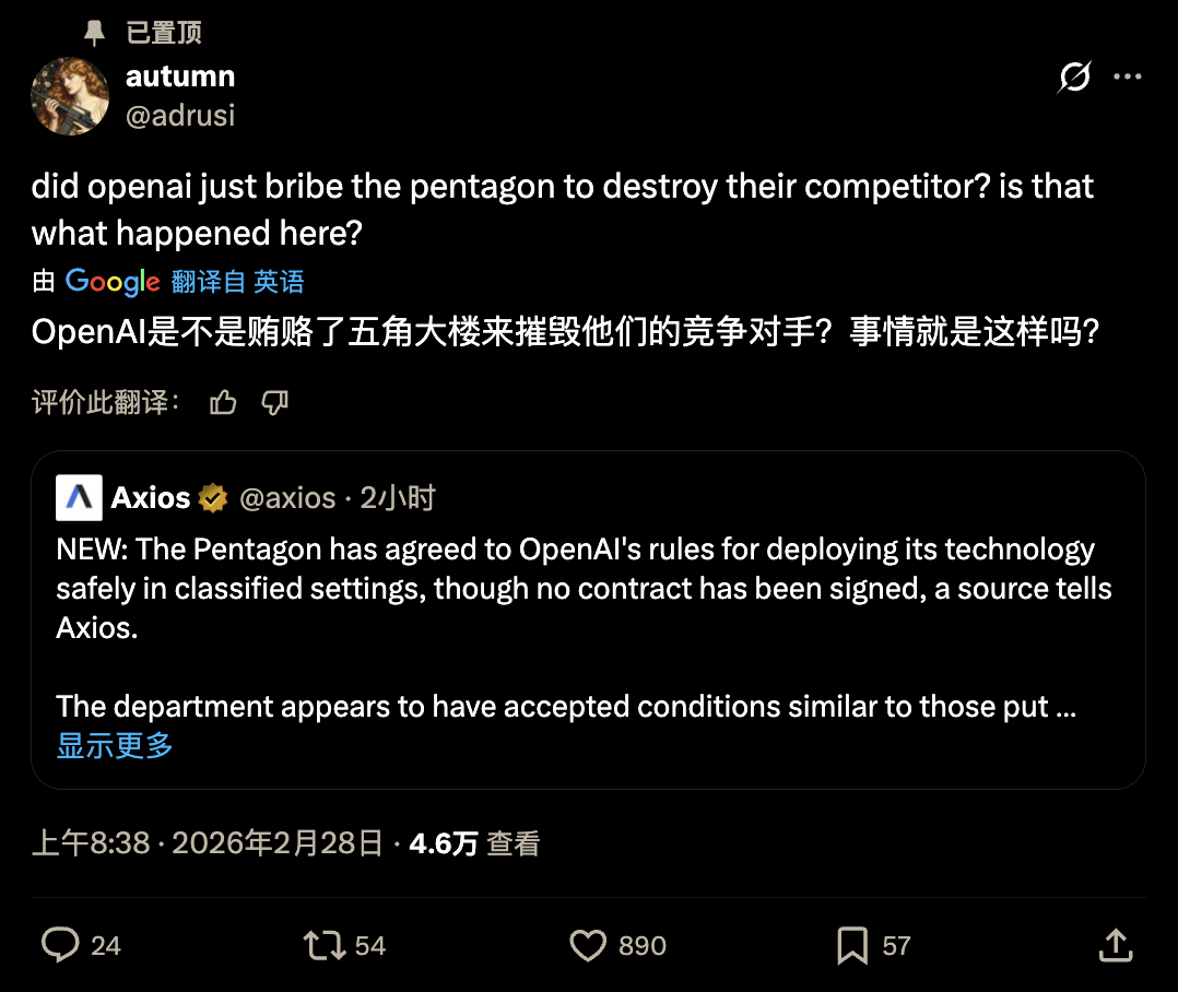 有人猜测,OpenAI是不是暗中贿赂了五角大楼,好来摧毁Anthropic?