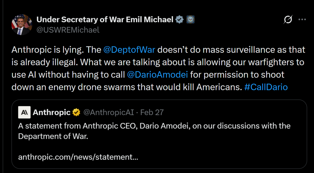 除了被特朗普拉黑,美国战争部副部长也在X上发出多篇檄文,讨伐Dario Amodei。